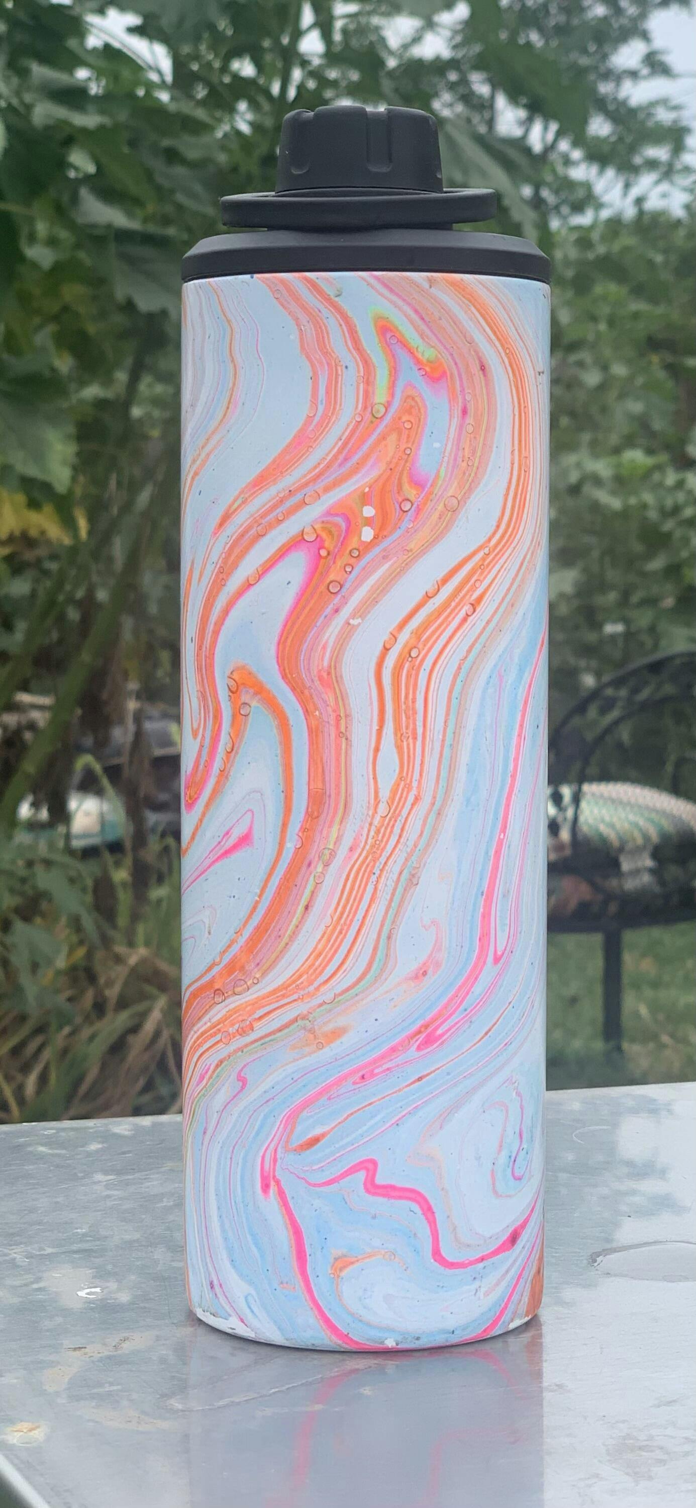 Psychedelic Painted Psychedelic 20oz stainless steel sports water bottle with 2 lids One black black with a handle and one clear lid with sliding seal.
